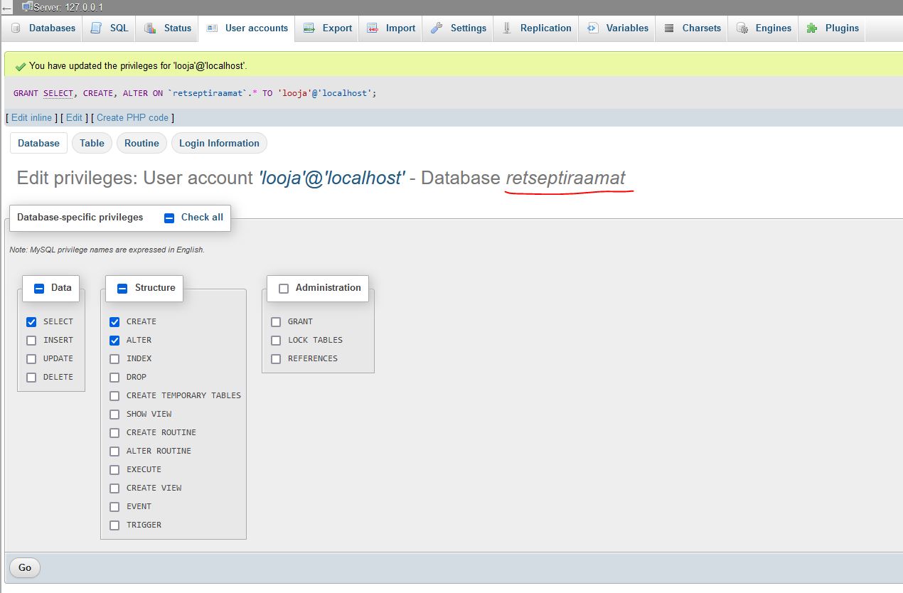 Andmebaasisüsteemide alused Localhost/phpMyAdmin - Kasutajad ja õigused Localhost/MSSQL - Kasutajad ja õigused Localhost/phpMyAdmin - Kasutajad ja õigused Создаем пользователя:Даем права на select, alter, create:Проверяем: Localhost/MSSQL - Kasutajad ja õigused Создаем нового пользователя: