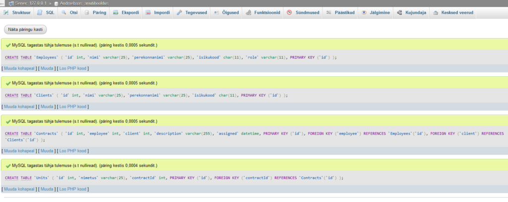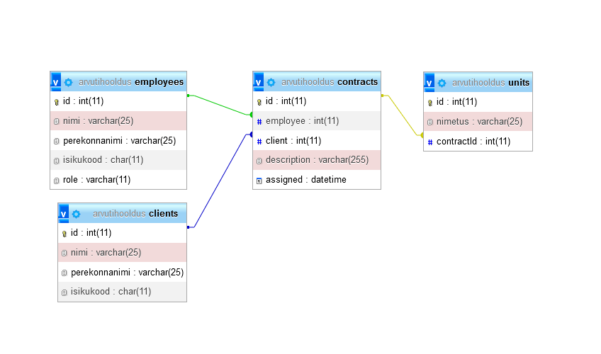 CREATE TABLE `Employees` ( `id` int, `nimi` varchar(25), `perekonnanimi` varchar(25), `isikukood` char(11), `role` varchar(11), PRIMARY KEY (`id`) ); CREATE TABLE `Clients` ( `id` int, `nimi` varchar(25), `perekonnanimi` varchar(25), `isikukood` char(11), PRIMARY KEY (`id`) ); CREATE TABLE `Contracts` ( `id` int, `employee` int, `client` int, `description` varchar(255), `assigned` datetime, PRIMARY KEY (`id`), FOREIGN KEY (`employee`) REFERENCES `Employees`(`id`), FOREIGN KEY (`client`) REFERENCES `Clients`(`id`) ); CREATE TABLE `Units` ( `id` int, `nimetus` varchar(25), `contractId` int, PRIMARY KEY (`id`), FOREIGN KEY (`contractId`) REFERENCES `Contracts`(`id`) );