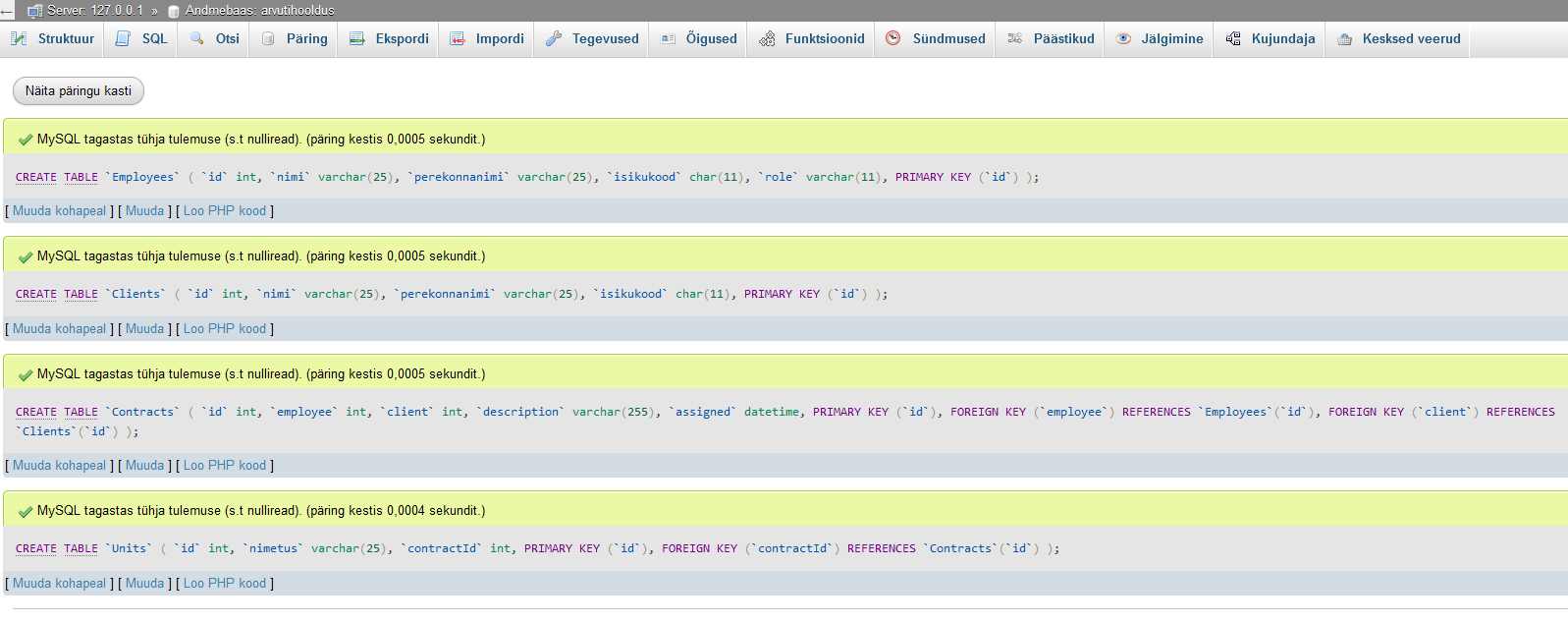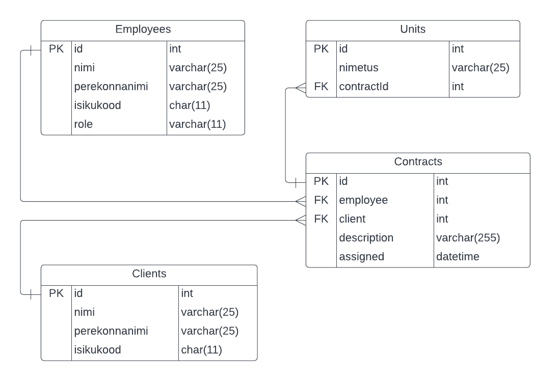 CREATE TABLE `Employees` ( `id` int, `nimi` varchar(25), `perekonnanimi` varchar(25), `isikukood` char(11), `role` varchar(11), PRIMARY KEY (`id`) ); CREATE TABLE `Clients` ( `id` int, `nimi` varchar(25), `perekonnanimi` varchar(25), `isikukood` char(11), PRIMARY KEY (`id`) ); CREATE TABLE `Contracts` ( `id` int, `employee` int, `client` int, `description` varchar(255), `assigned` datetime, PRIMARY KEY (`id`), FOREIGN KEY (`employee`) REFERENCES `Employees`(`id`), FOREIGN KEY (`client`) REFERENCES `Clients`(`id`) ); CREATE TABLE `Units` ( `id` int, `nimetus` varchar(25), `contractId` int, PRIMARY KEY (`id`), FOREIGN KEY (`contractId`) REFERENCES `Contracts`(`id`) );